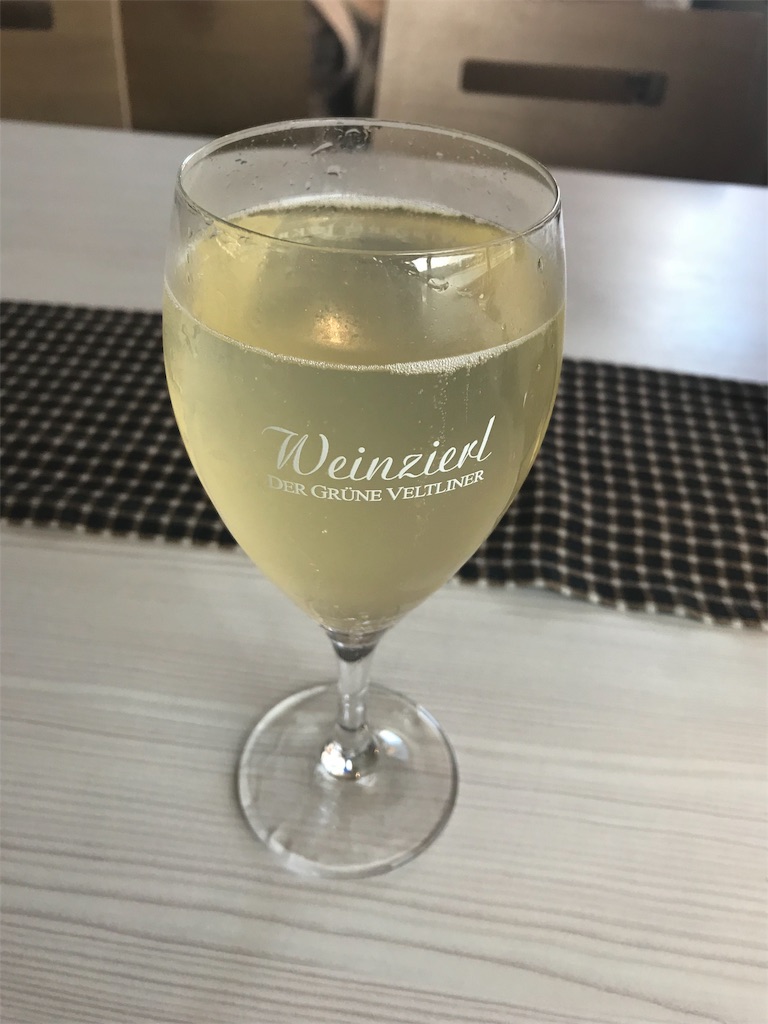 ゲシュプリッツァー(白ワインを炭酸水で1:1に割ったもの)を楽しみ、のんびり沿岸の風景を見ながら優雅な船旅なうよ。